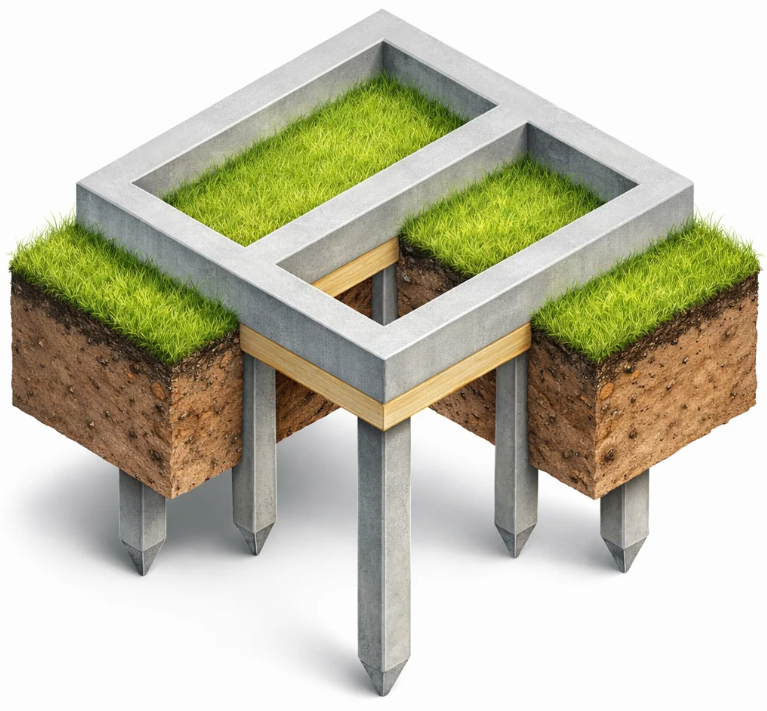 Сваи прорезают слабые слои (торф, ил, насыпной грунт) и опираются на плотные несущие пласты. Это единственное решение для болотистых и обводнённых участков.
