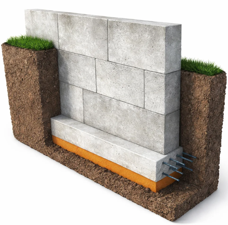 Блоки укладываются значительно быстрее, чем заливка монолитного бетона. Не нужно ждать набора прочности (28 суток) — сразу после монтажа можно продолжать строительство (гидроизоляция, перекрытия).